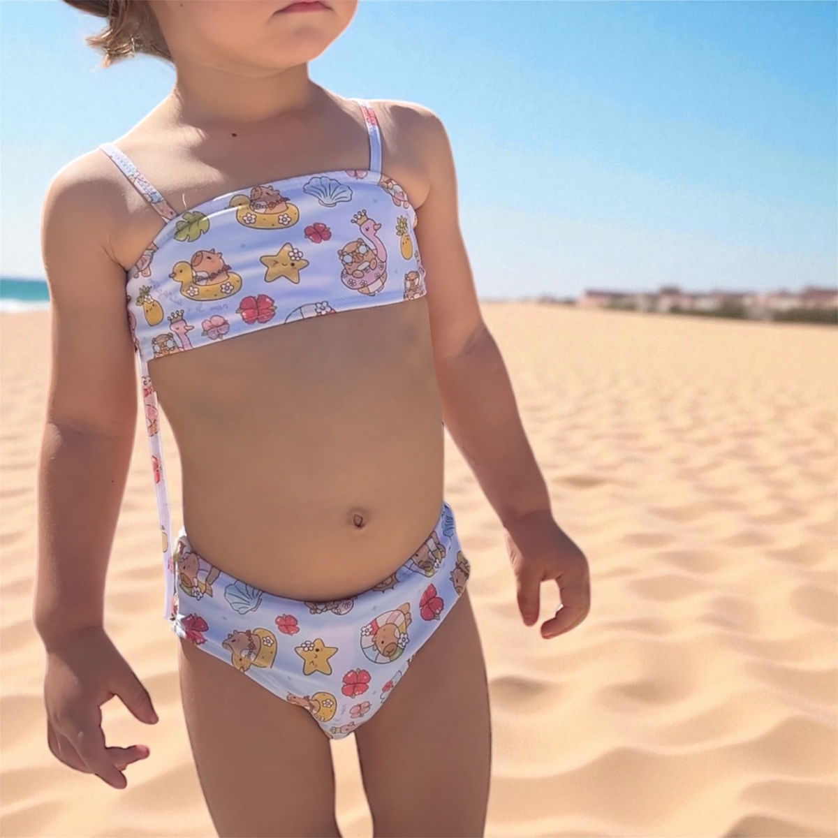 El top tiene forro en la parte delantera y 4 tiras (dos delanteras y dos traseras) para ajustar el mismo al cuerpo de la niña sin complicaciones. Puede optar por cruzar las tiras traseras, por atarla al cuello, por atarla en hombros.... según preferencia y comodidad.